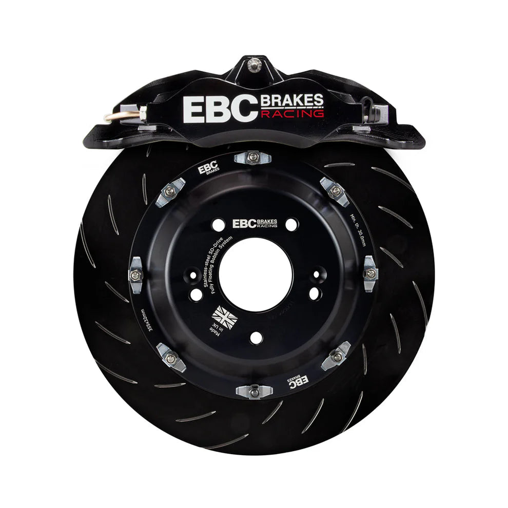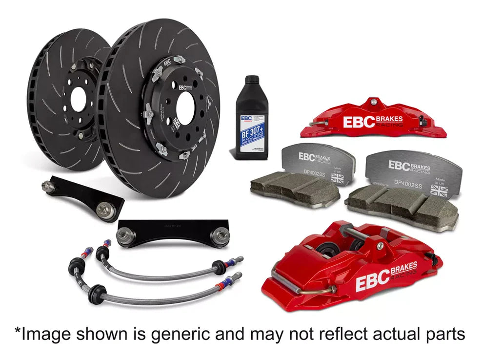 EBC RACING'S BIG BRAKE KITS REPRESENT THE ULTIMATE BRAKING UPGRADE, REPLACING THE VEHICLES ORIGINAL FRONT BRAKE CALIPERS WITH HIGH PERFORMANCE MULTI‐PISTON ALTERNATIVES AND REPLACING THE ORIGINAL BRAKE ROTOR WITH A FULLY‐FLOATING OVERSIZE 2‐PIECE ROTOR. EBC RACING BRAKE KITS COME WITH FULLY‐FLOATING 2‐PIECE ROTORS AS STANDARD, WHEREAS MANY COMPETITOR KITS USE 2‐PIECE BOLTED ROTORS OR DEMAND A HEFTY PREMIUM TO UPGRADE TO FLOATING ROTORS. FLOATING 2‐PIECE ROTORS ALLOW THE CAST IRON ROTOR RING TO FLOAT INDEPENDENTLY OF THE HUB, PREVENTING DISC CRACKING AND LEADING TO RELIABLE PERFORMANCE EVEN WHEN SUBJECTED TO THE MOST DEMANDING DRIVING CONDITIONS. THIS ENSURES A VEHICLE UPGRADE THAT ENSURES AN OPTIMUM BRAKE BALANCE AND YIELDS SHORTER STOPPING DISTANCES. EBC RACING BRAKE KITS COME WITH EVERYTHING YOU NEED IN THE BOX AND A DETAILED VEHICLE SPECIFIC INSTALLATION PACK, INCLUDING RACE SPEC BRAKE FLUID FOR THE FINAL SYSTEM BLEED. EBC RACING BRAKE KITS PROVIDE A HASSLE‐FREE WAY OF TOTALLY TRANSFORMING YOUR VEHICLES BRAKING PERFORMANCE AND ARE AVAILABLE IN A VARIETY OF DISC SIZES AND CALIPER COLOUR OPTIONS TO SUIT ANY AESTHETIC PREFERENCE OR WHEEL SIZE.